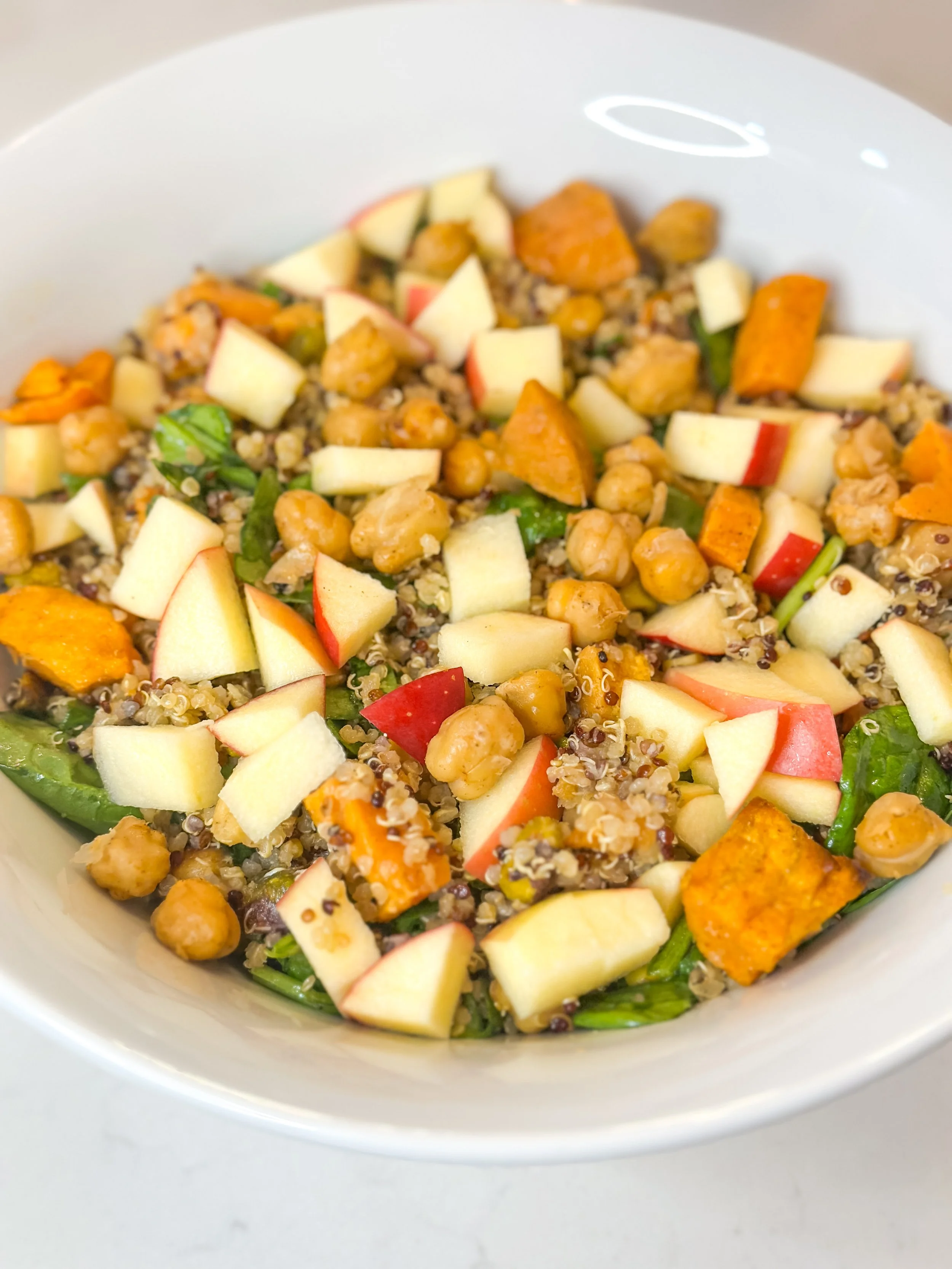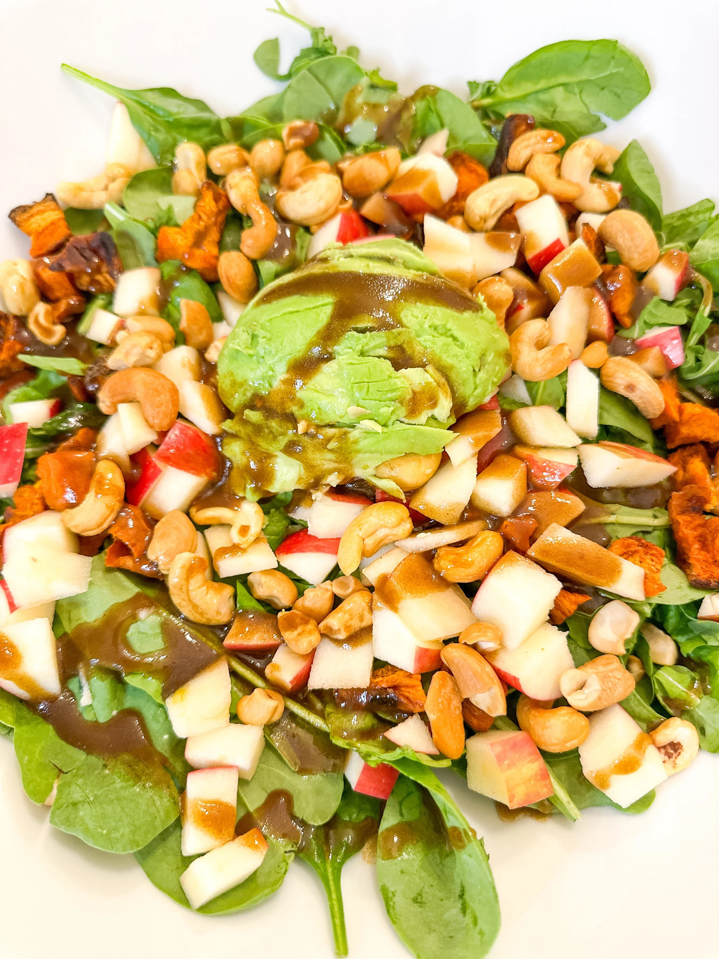 Fall is the season of crisp apples, cozy flavors, and hearty salads that feel both nourishing and comforting. This Maple Orchard Bowl brings together everything I love about the season: roasted sweet potatoes, crunchy apples, buttery avocado, and toasted cashews, all tossed over a bed of greens and finished with a silky maple balsamic vinaigrette.
