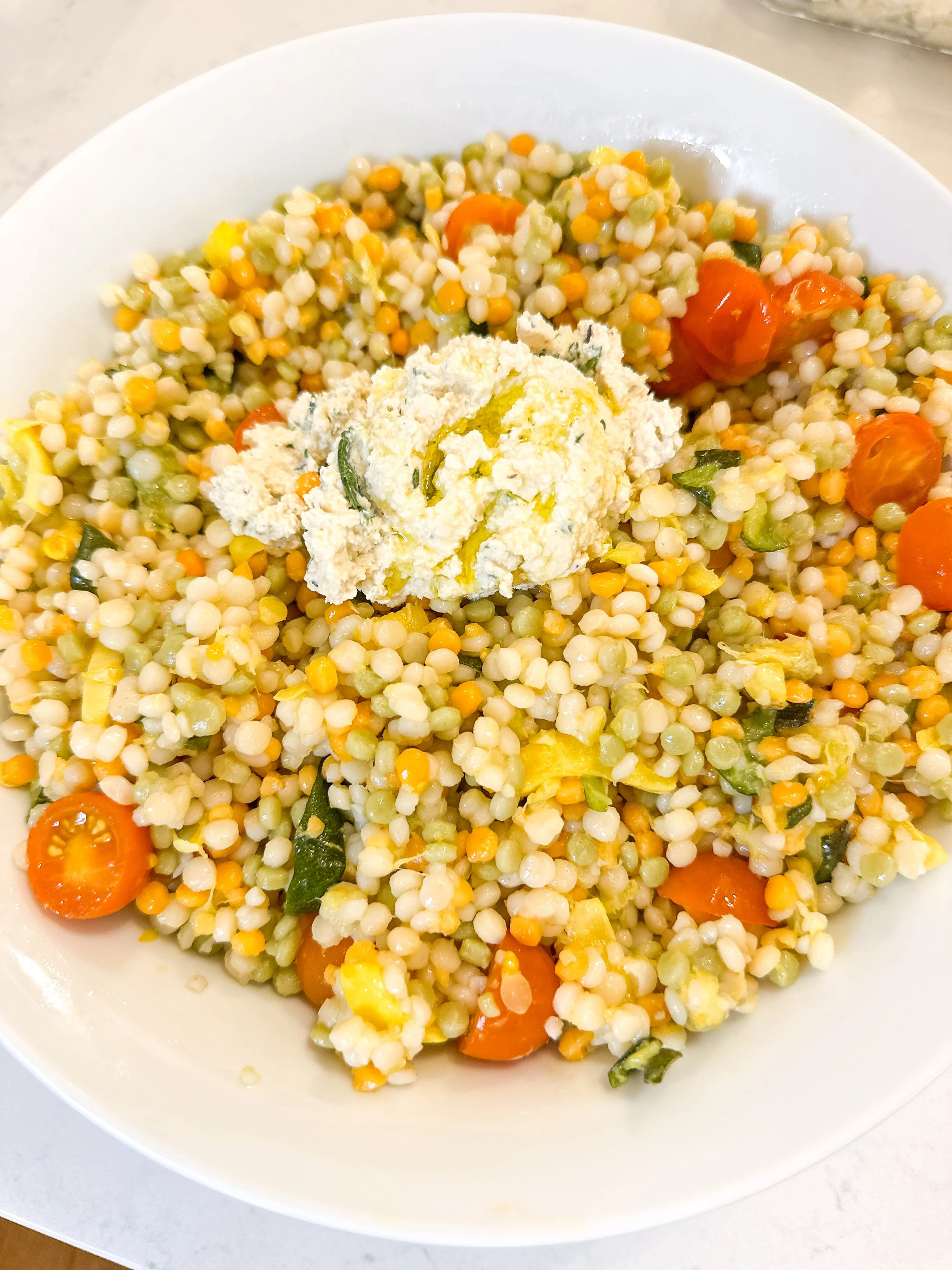 The Farmstand Couscous Bowl is inspired by the kind of fresh, colorful produce you find at late-summer and early-fall farmers markets. Fluffy pearl couscous forms the base, while zucchini, summer squash, and juicy tomatoes add brightness and texture. A generous spoonful of creamy vegan ricotta ties it all together, making this dish hearty yet refreshing.