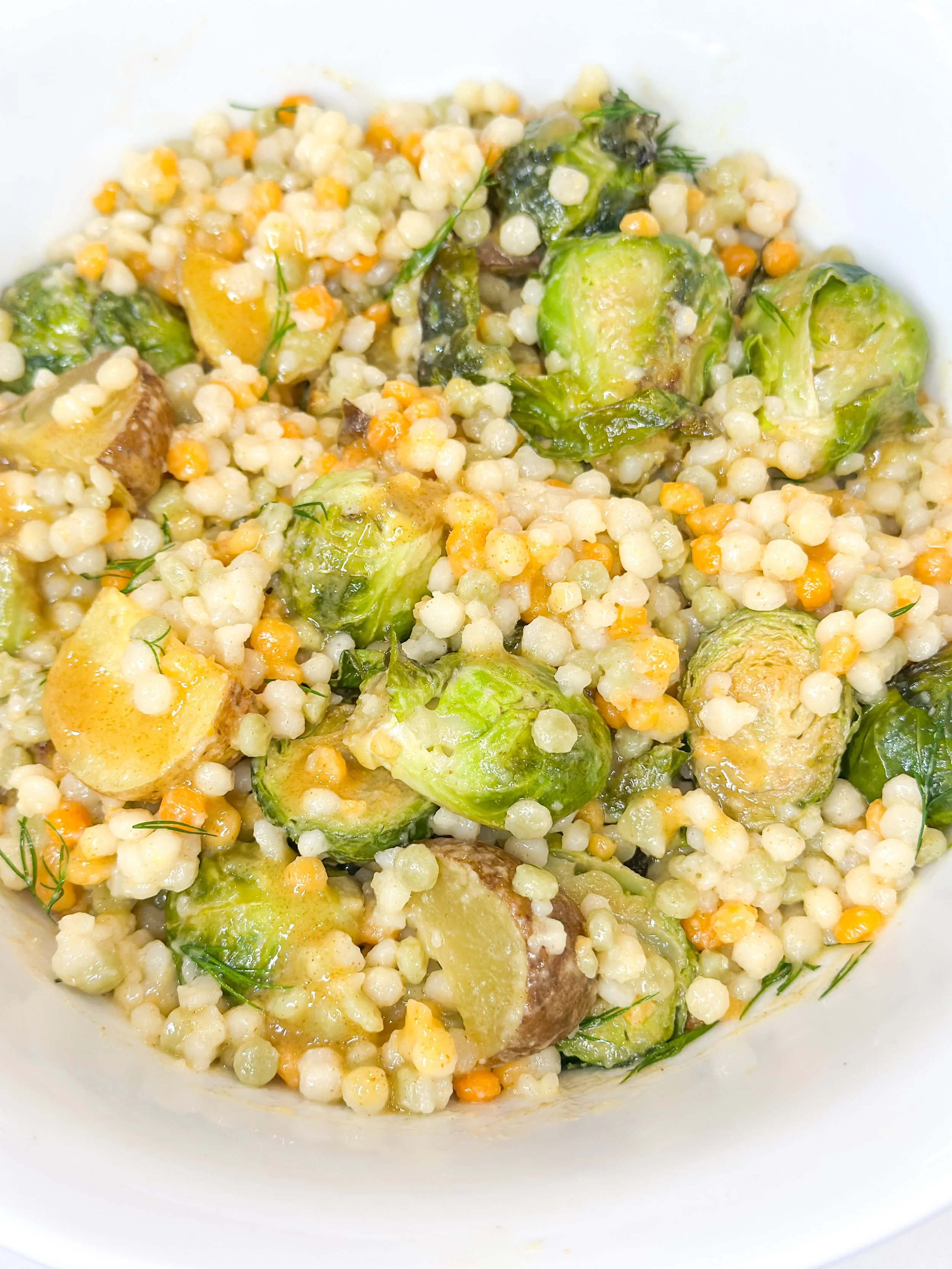 Assemble the bowl β In a large serving bowl, combine couscous, sautΓ©ed vegetables, and cherry tomatoes. Toss gently.