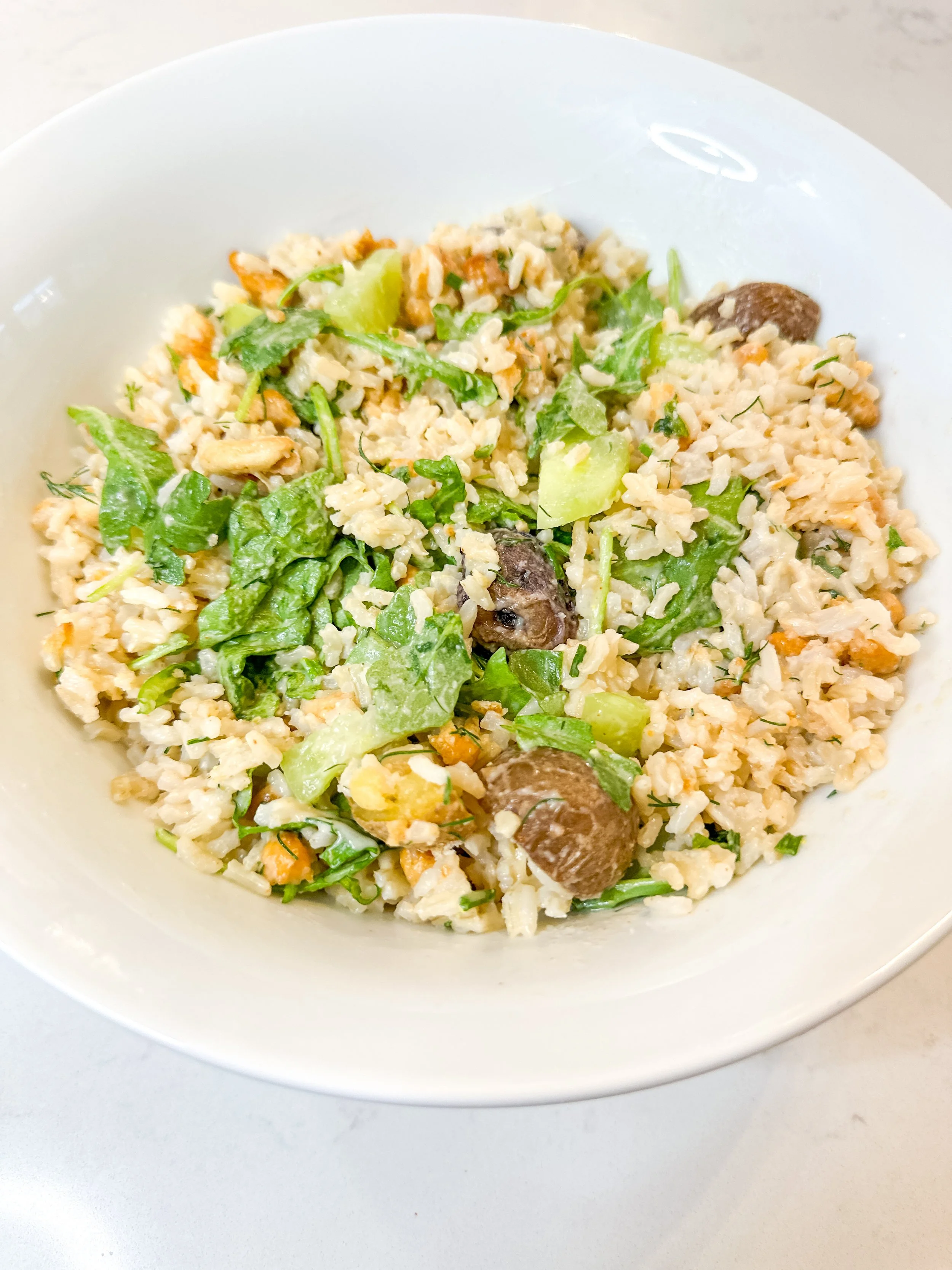 Layer the cooked rice in a bowl. Add crispy potatoes, cucumbers, greens, and roasted beans (if using). Drizzle with creamy dill ranch and top with fresh herbs.